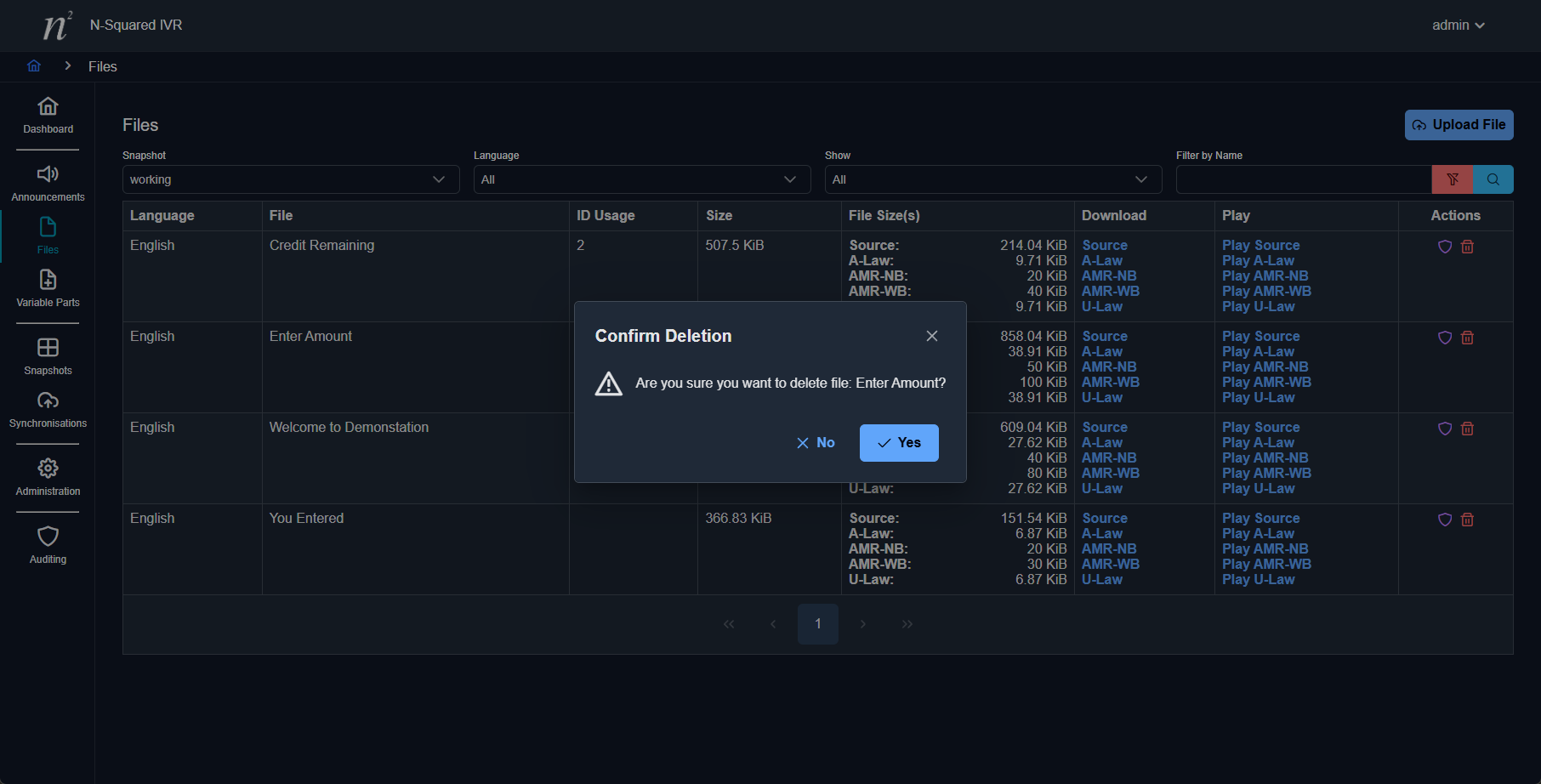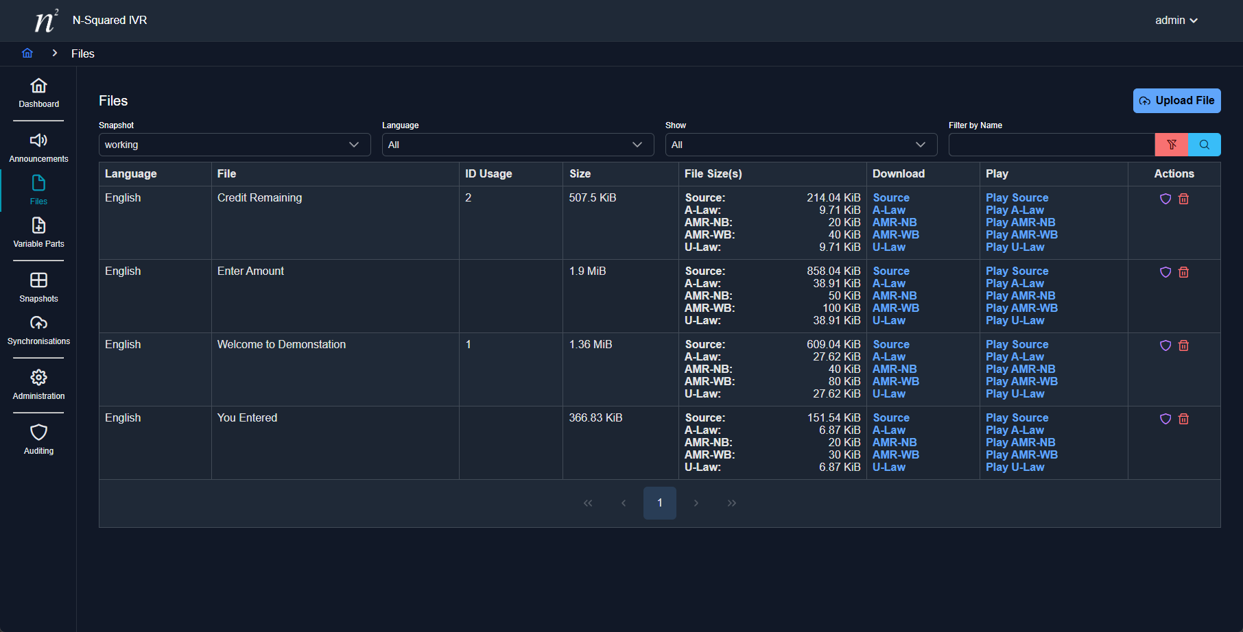 page enables management of the audio files available to the IVR for inclusion in announcements: