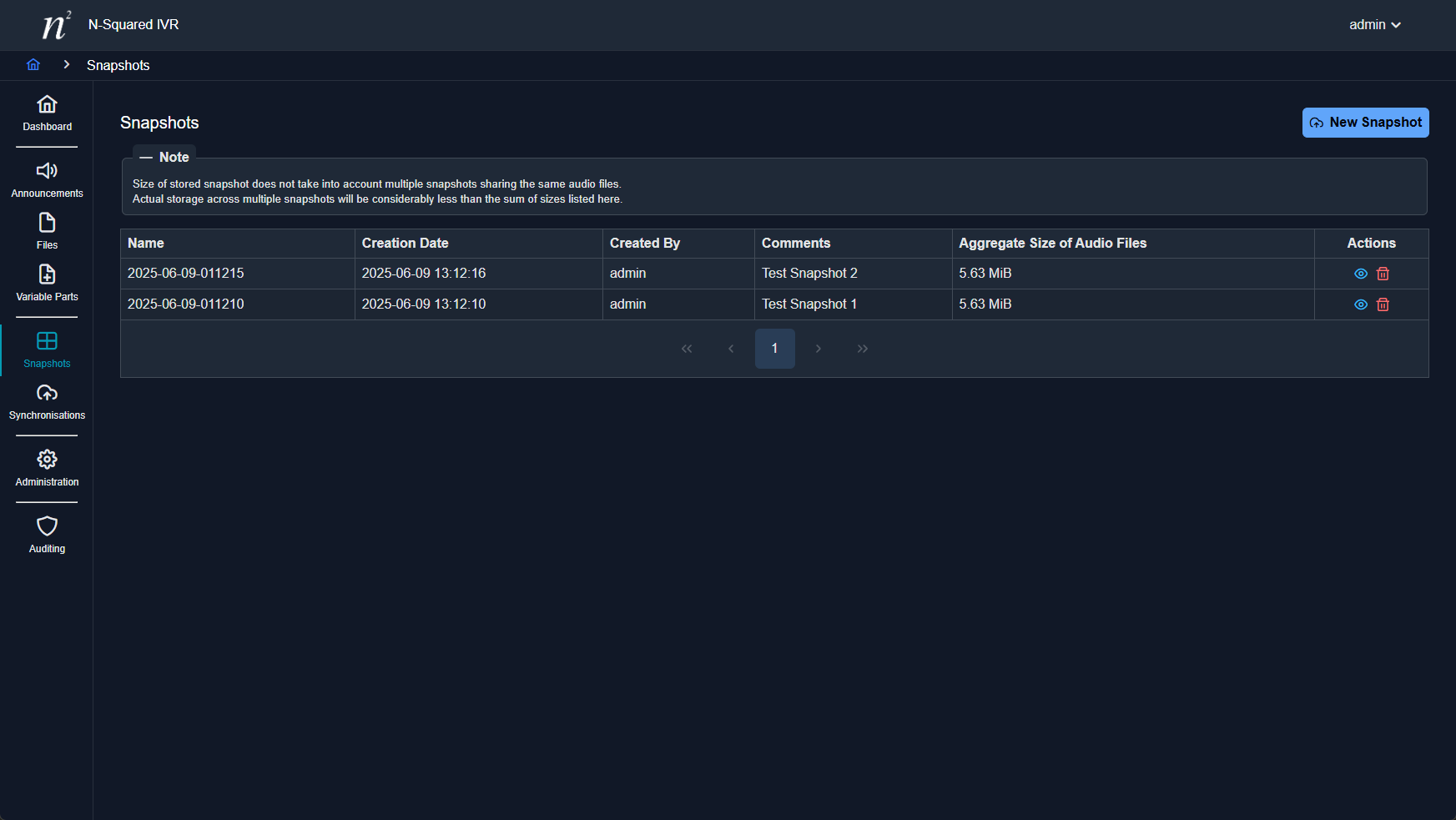 Each snapshot created reflects the IVR configuration (announcement IDs, and files) as at the time the snapshot is created. A snapshot is either of the live (active) set of data, or the working set.