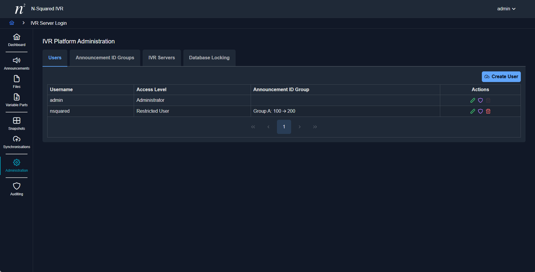 The IVR GUI provides features for managing the user list with secure access to the GUI for announcement management.