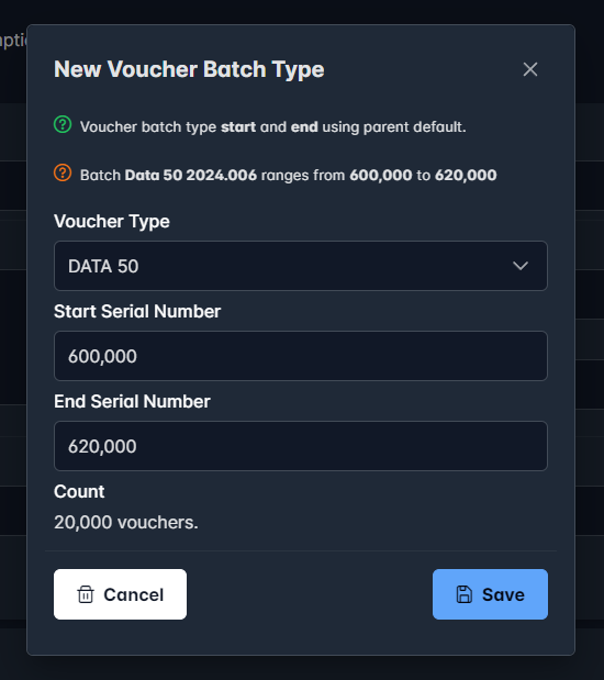 Voucher Batch Types may be configured anywhere within their parent Voucher Batch range; not all serial numbers need to be covered by a Voucher Batch Type.