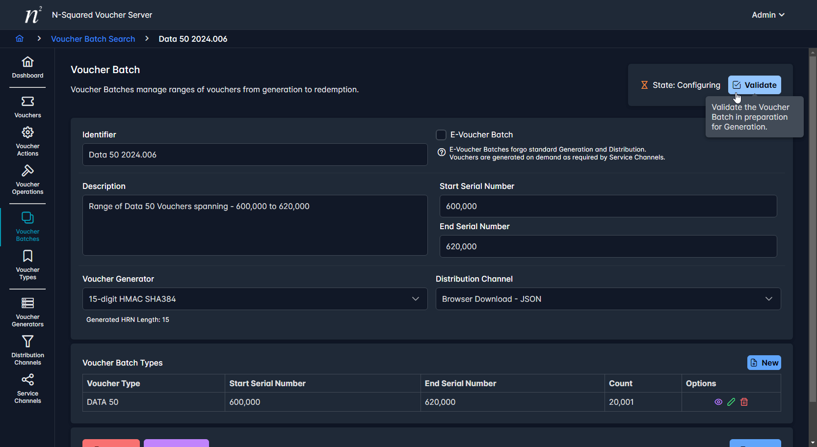 Validated | The Voucher Batch configuration has been validated and is valid for generation. |