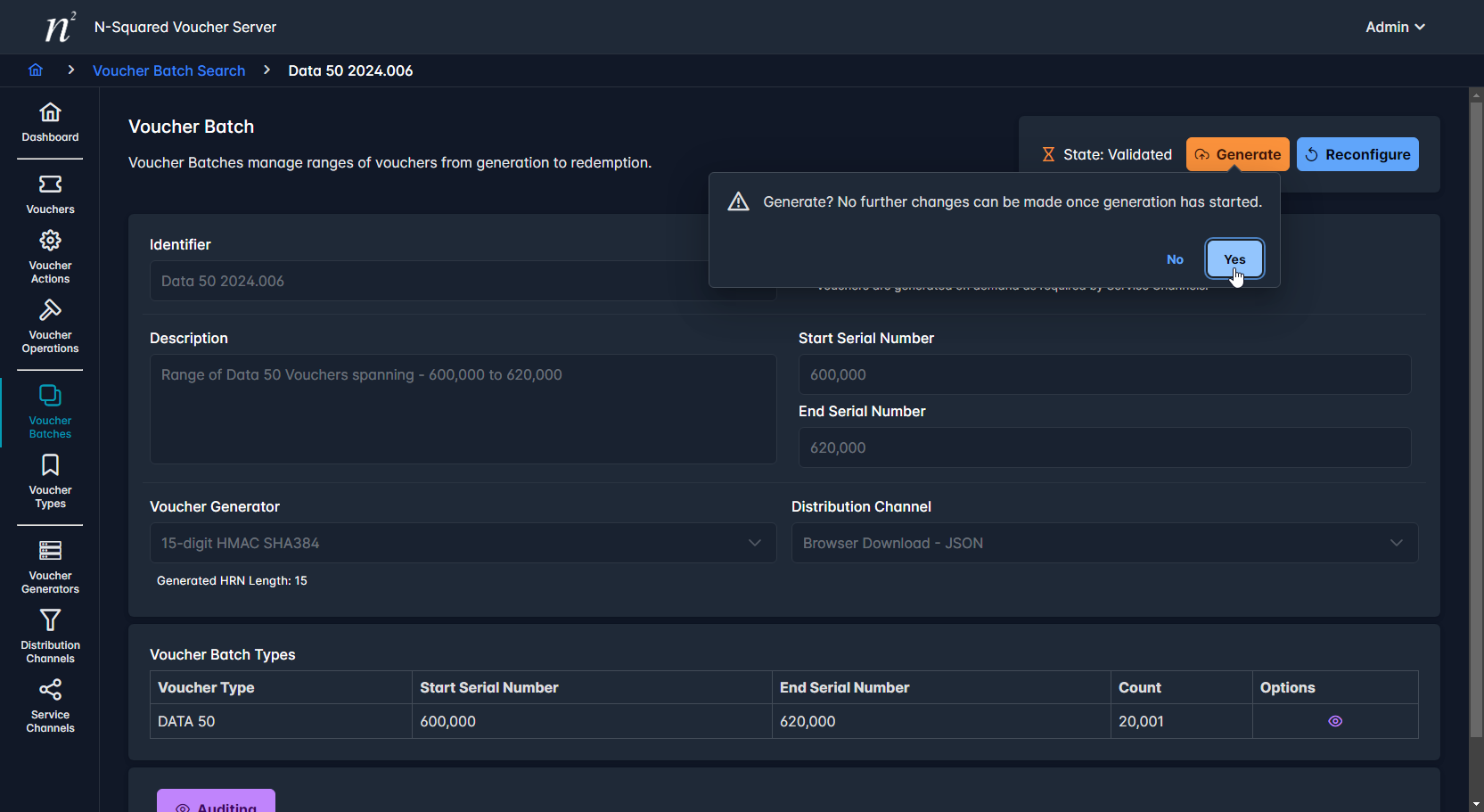 - Perform Voucher generation of the configured Voucher Batch, after this no further changes may be made to the Voucher Batch.Reconfigure