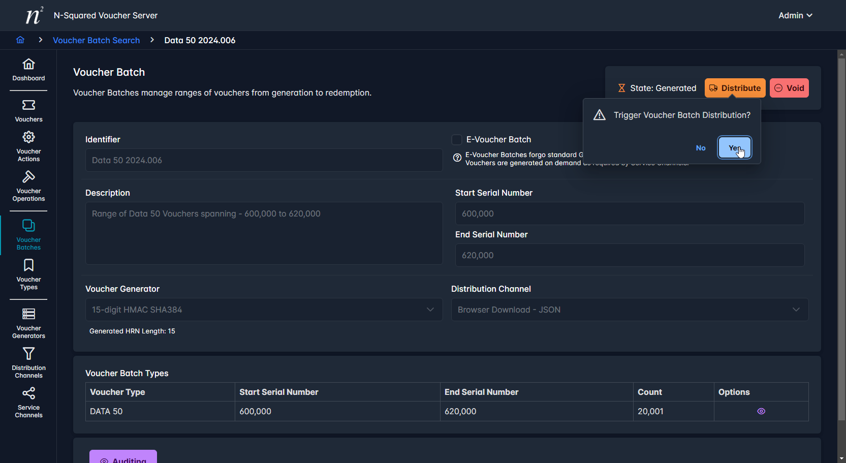 Voucher Batches differ from E-Voucher batches as Vouchers are all generated up front before distribution of the Voucher Batch. The distribution of Voucher Types within the Voucher Batch once generated is fixed.