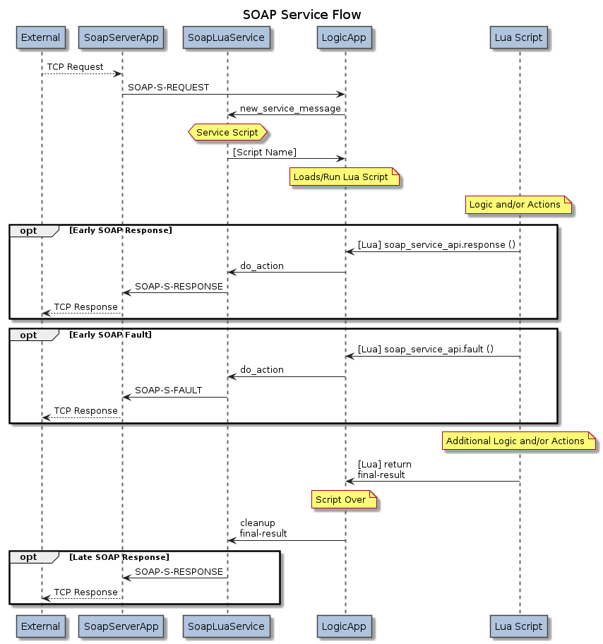 The SoapLuaService receives messages from one or more instances of the SoapServerApp which is configured to receive SOAP/HTTP(S) Requests from an external client.